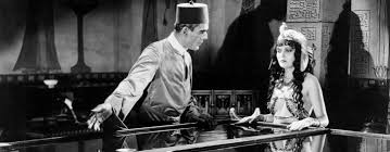 Pero decir La momia es decir Boris Karloff. Espectacular, tremendo, colosal. Y todas estas palabras me parecen muy poco. Lo poco que sale como momia, es decir, envuelto en vendajes se te queda en la memoria a fuego. Pero como Ardeth Bay lo borda de tal modo que es difícil encontrar la palabra adecuada. Su capacidad para resultar inexpresivo haciendo ver que su carne está momificada es brutal y esos primeros y primerísmos planos mostrando unos ojos que hipnotizan se han quedado, y con razón, para la historia del cine. Además, aparece muy delgado (o fibrado, Karloff en Frankenstein ya dio muestras de ello) y eso viene de perlas al personaje. Si en Frankenstein lo clavó, aquí se superó.